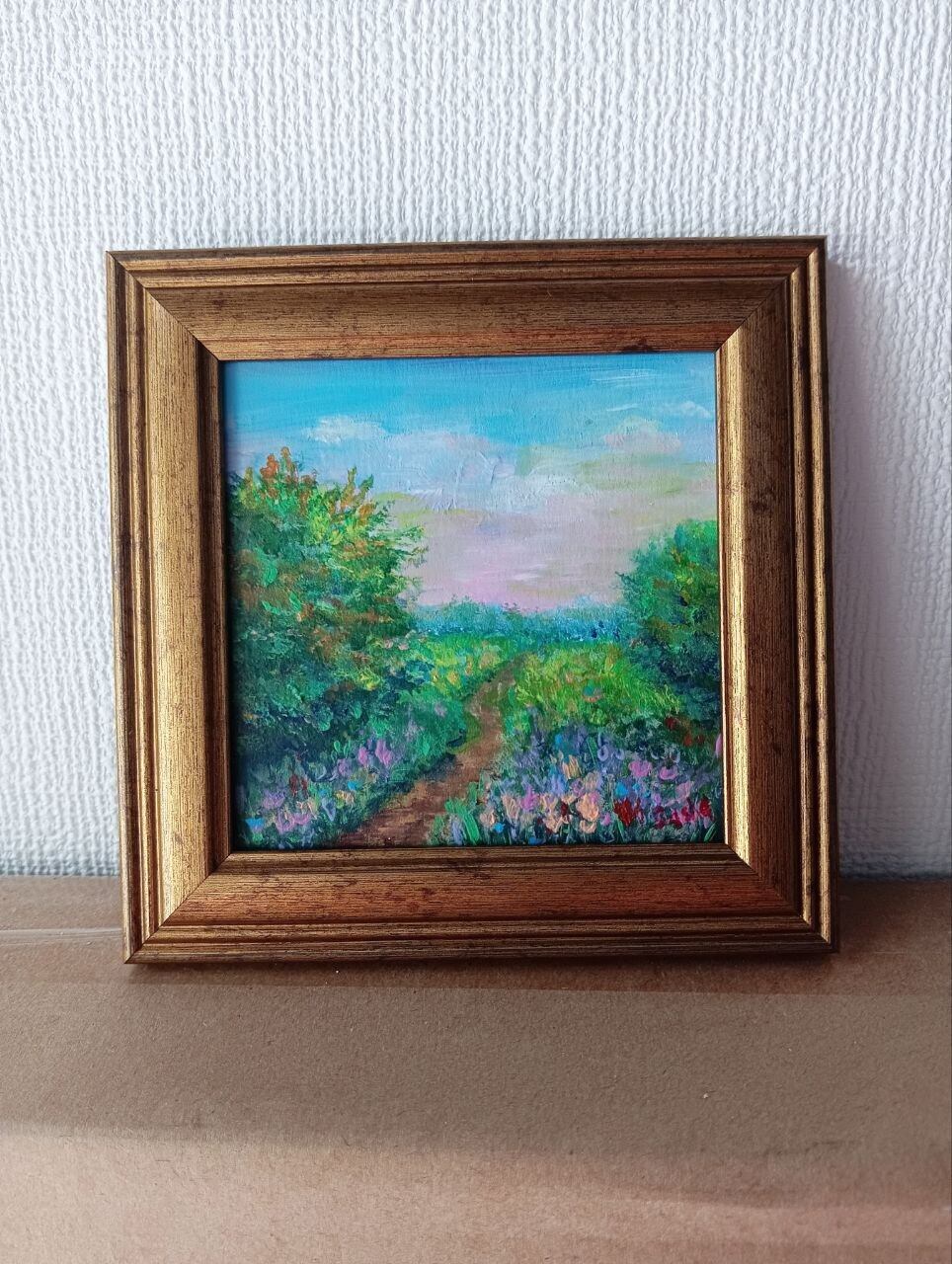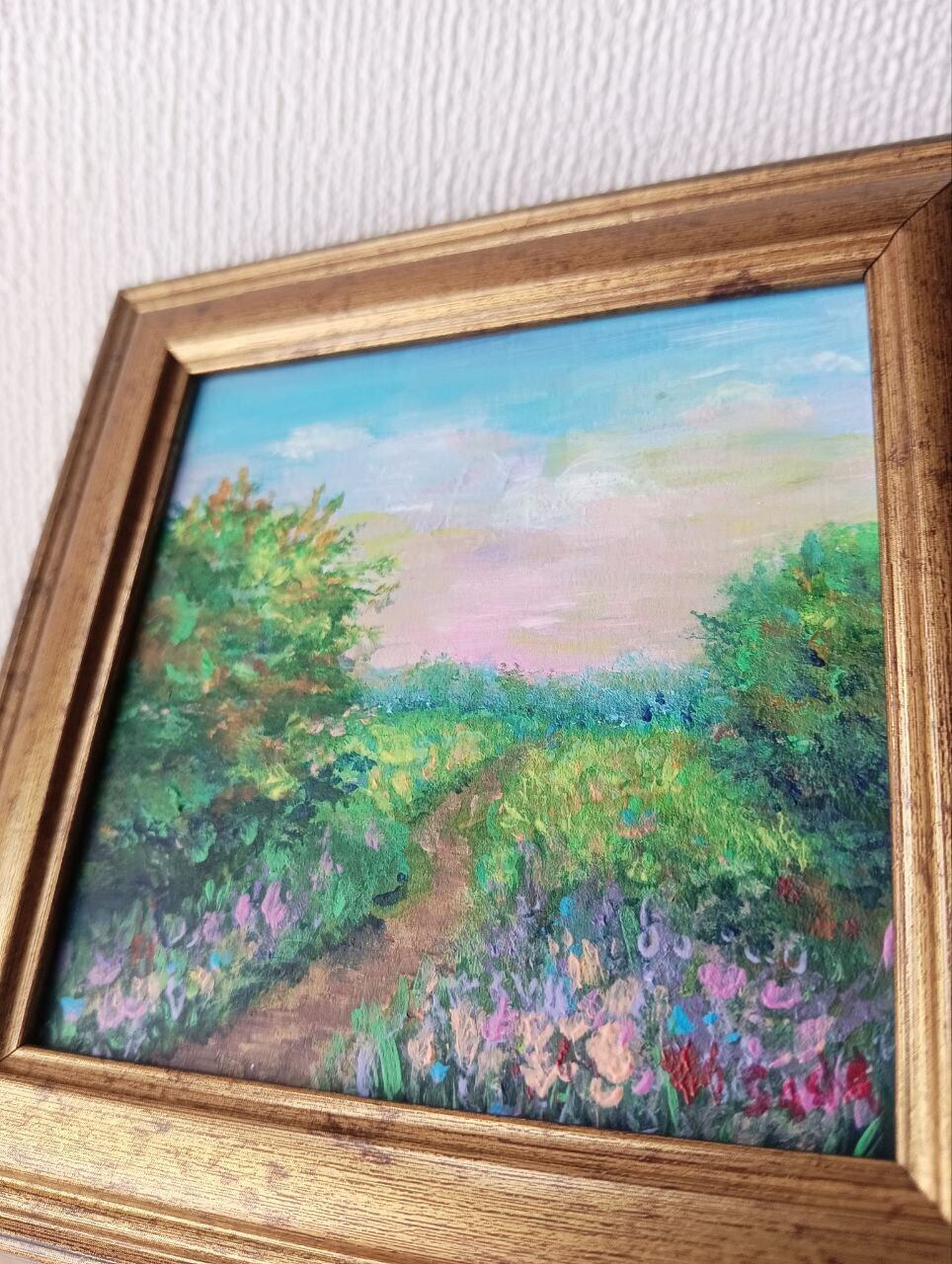 【原画】「花咲く小道」アクリル画・ミニ額装アート(8×8cm)