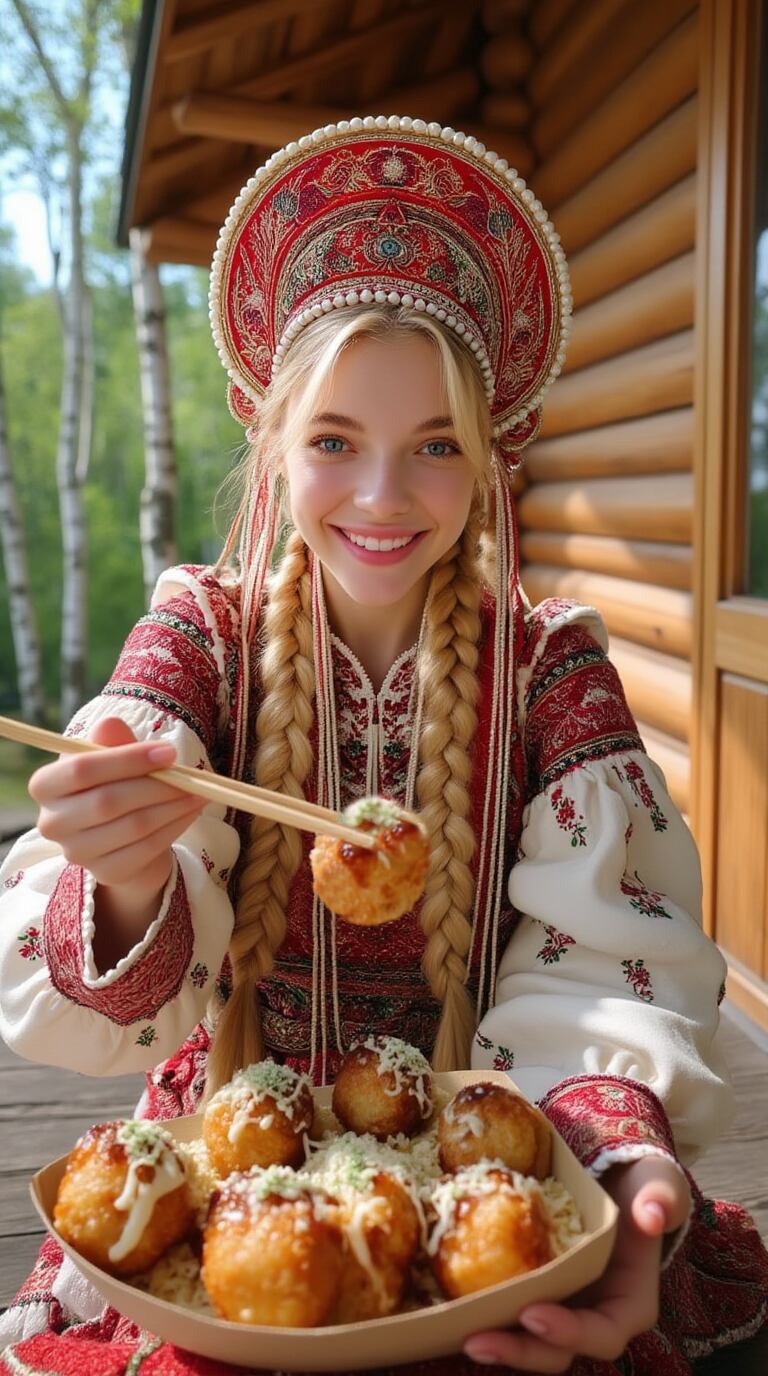 AIで作成した、たこ焼きを食べているロシアの女性のイメージです。