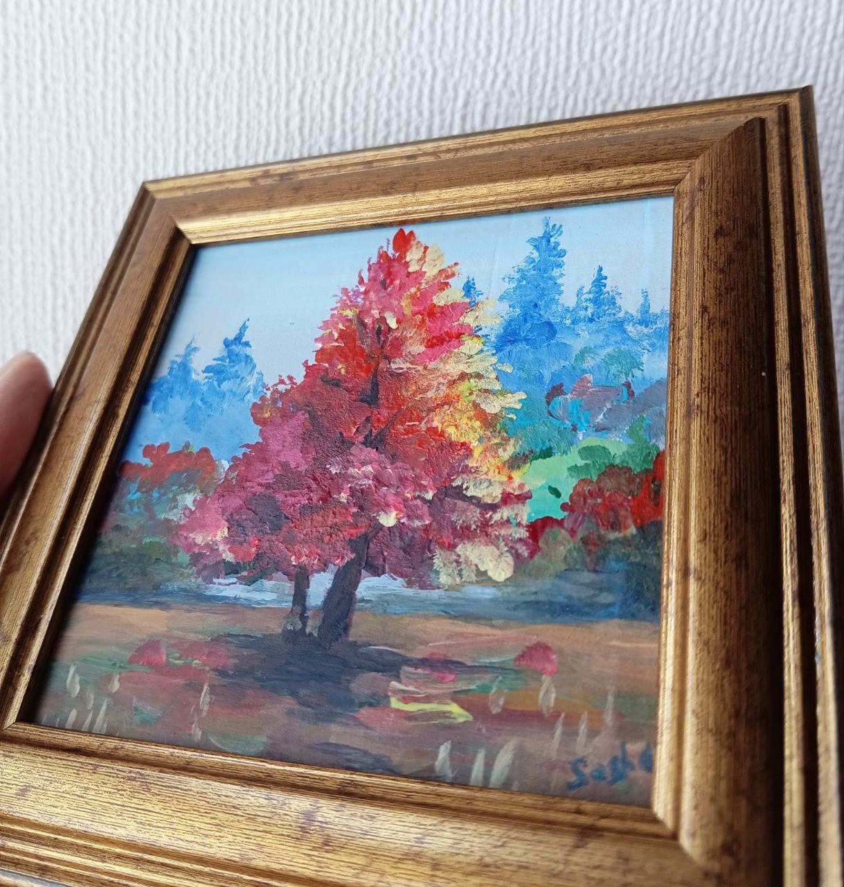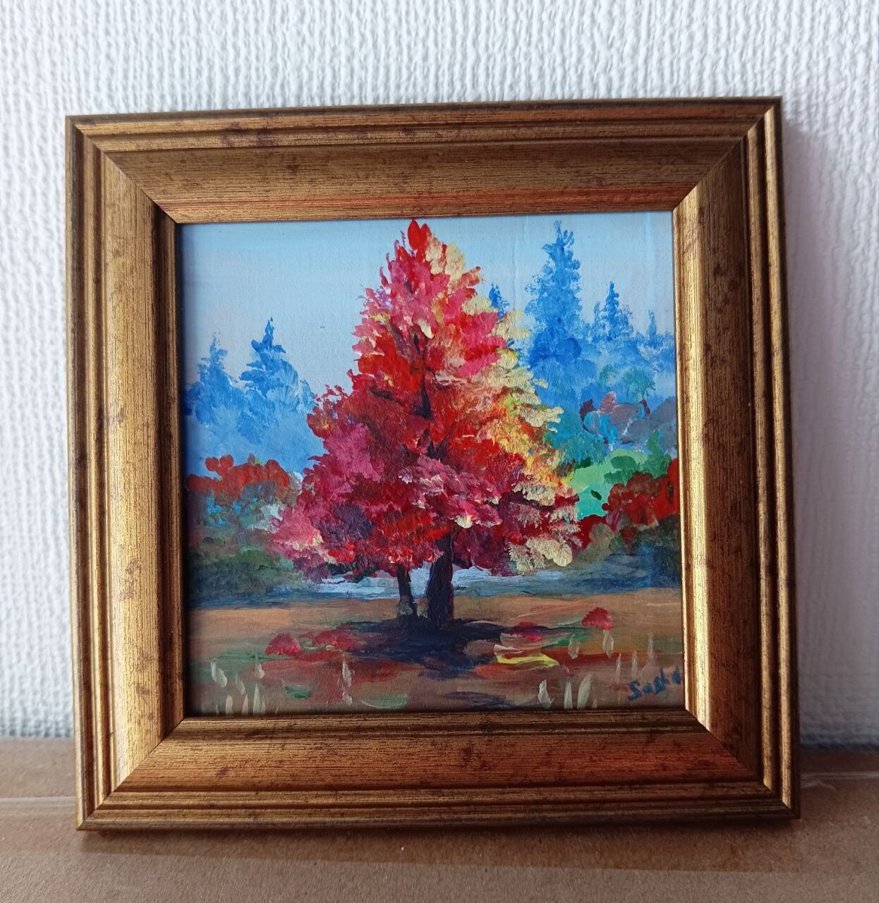 秋の澄んだ空の下で、真っ赤に染まった一本の木が静かに佇む風景を描いたミニアートです。